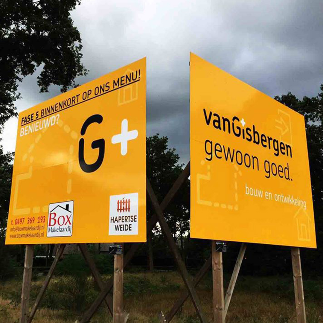 Wij bedrukken bouwborden voor jouw bouwproject! Je bestelt eenvoudig een bouwbord op maat met behulp van ons keuzemenu. Hierin kies je of je voor enkel- of dubbelzijdige bedrukking gaat, wat de dikte van het materiaal moet zijn en welke afwerking je wenst.